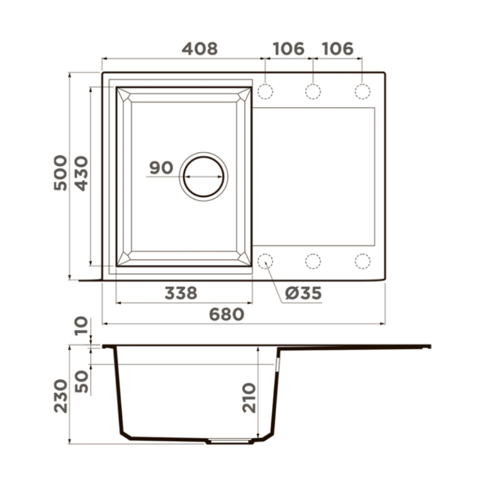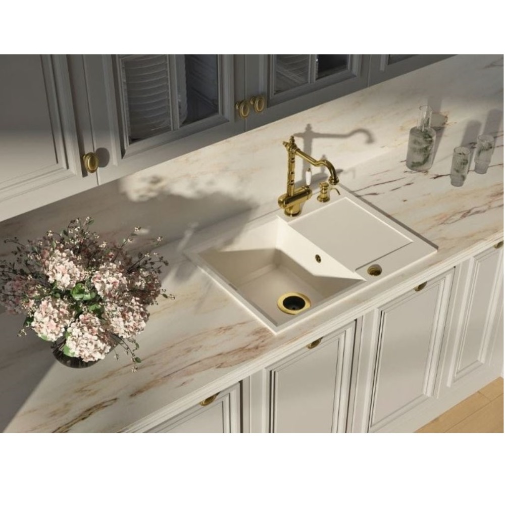 Мойка кухонная Omoikiri из коллекции Sakaime 68-WH имеет размеры 680х500 мм., изготовлена из искусственного гранита. Форма — прямоугольная, одна чаша без отверстия для смесителя. Сифон в комплекте. Ширина чаши 33,8. Врезной монтаж.
