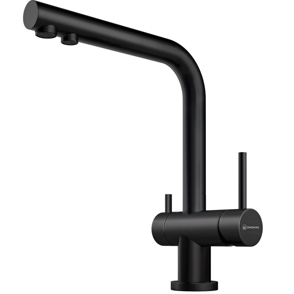 Смеситель для кухни Omoikiri Nagano с подключением фильтра оснащен рычажным управлением для регулировки температуры и напора воды. Горизонтальный монтаж на 1 отверстие. Поворотный излив 176 мм.
