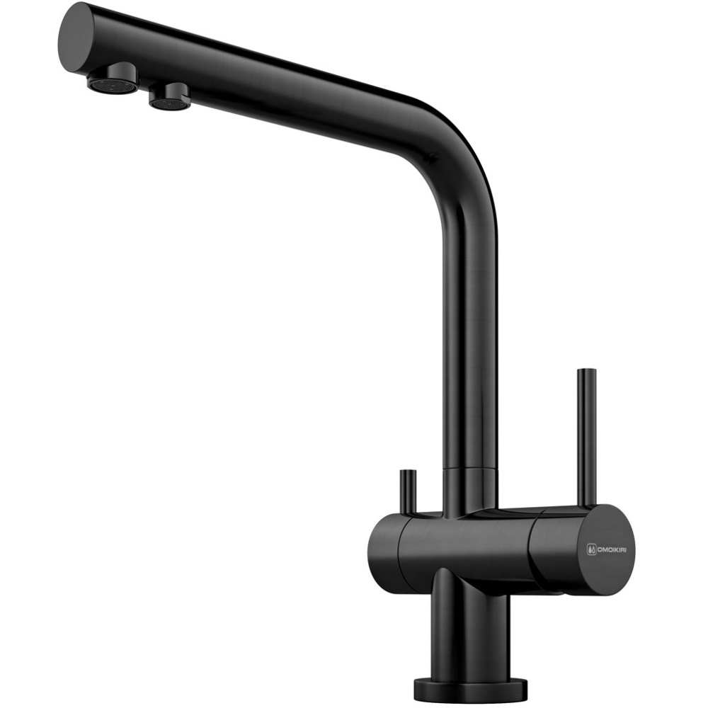 Смеситель для кухни Omoikiri Nagano с подключением фильтра оснащен рычажным управлением для регулировки температуры и напора воды. Горизонтальный монтаж на 1 отверстие. Поворотный излив 176 мм.