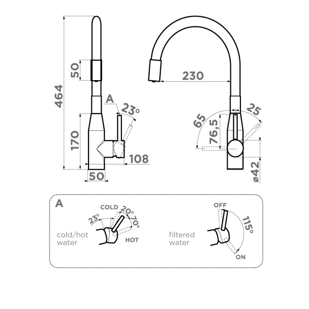 Смеситель для кухни Omoikiri Yatomi-2-Plus с подключением фильтра оснащен рычажным управлением для регулировки температуры и напора воды. Горизонтальный монтаж на 1 отверстие. Гибкий излив 230 мм.